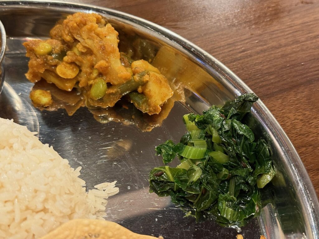 じゃが芋、カリフラワー、インゲン、大豆のタルカリ、青菜炒め、