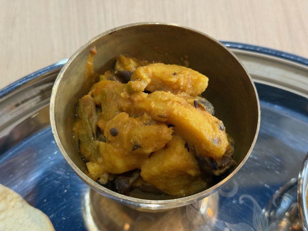 青菜炒め、カブリチャナ、バトマス、ケラウ、インゲン、じゃが芋のゲラグリコタルカリ、ポテトブジャ、パパドゥが並びました。