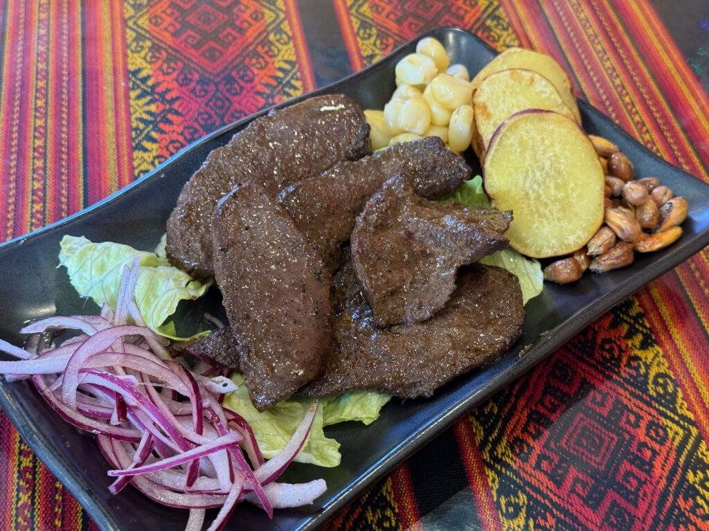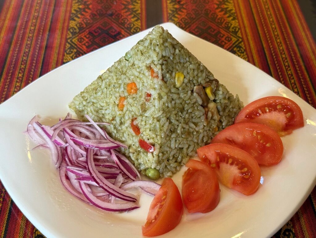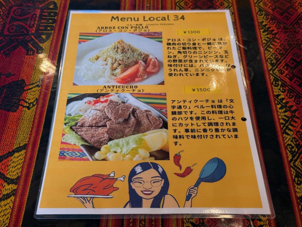 天理市のペルー料理「34番地 Local 34」さんへ伺いました。メニューブックにお薦めの様に記されている、アンティクーチョ ANTICUCHO、ロコト添え、アロスコンポジョ ARROZ CON POLLO を頂きました。サラダとオレンジ、パイナップル、苺のゼリーも供され、インカコーラも頂きました。