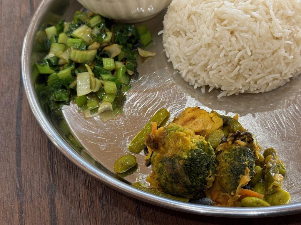 ブロッコリー、インゲン、大豆のタルカリ、青菜炒めが並びます。
