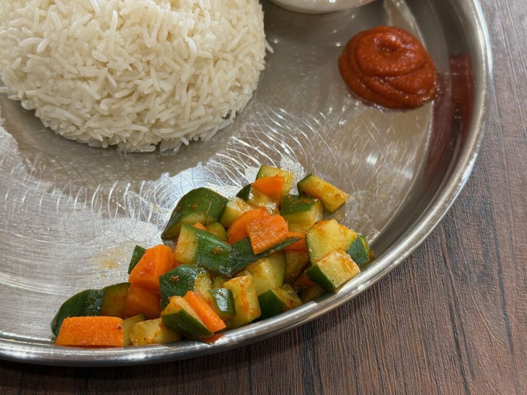 ダヒ、じゃが芋、人参、グリーンピースのタルカリ、トマトのアチャール、スライス野菜が並びました。