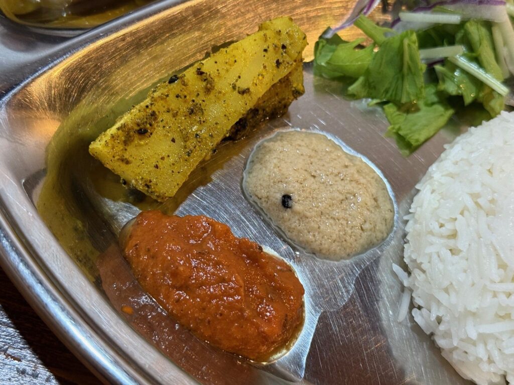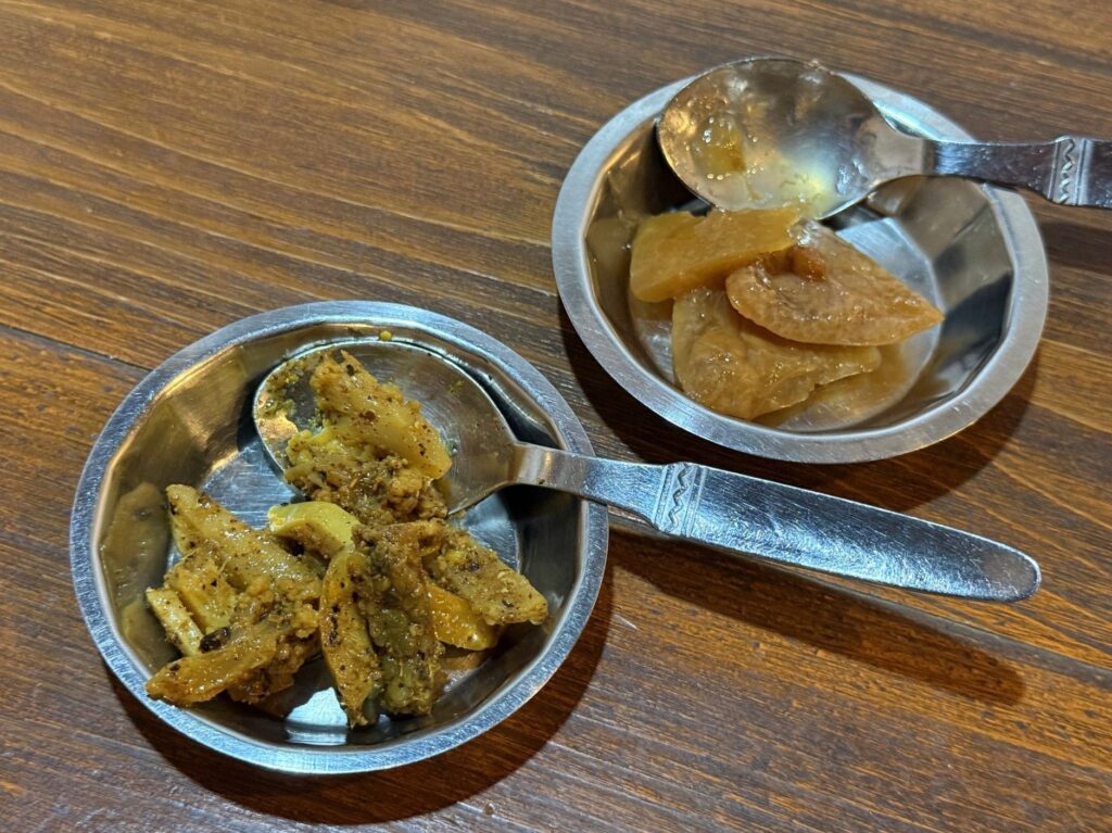 大根のアチャール、トマトのアチャール、ピーナッツのアチャール、青菜炒め、生野菜が並びました。