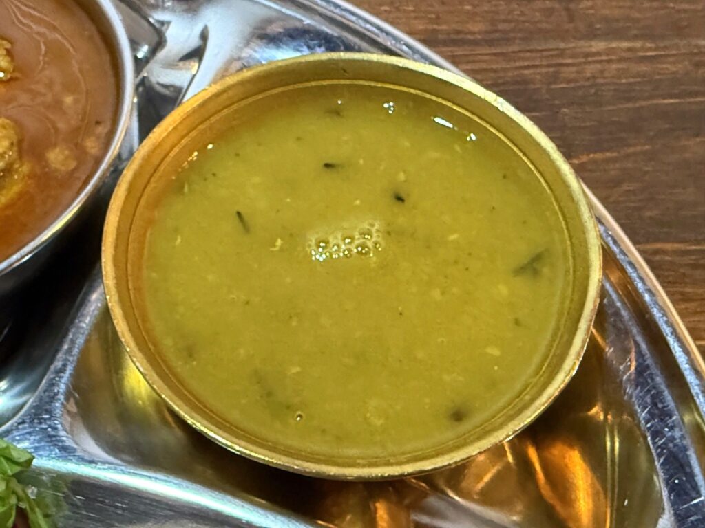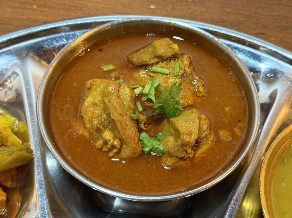 「MUSTANG THAKALI CHULO ダルバート食堂」さんのチキンカリー付きのダルバートです。ダルはいつものマス、ムスロ、ムング、ラハルのミックス、