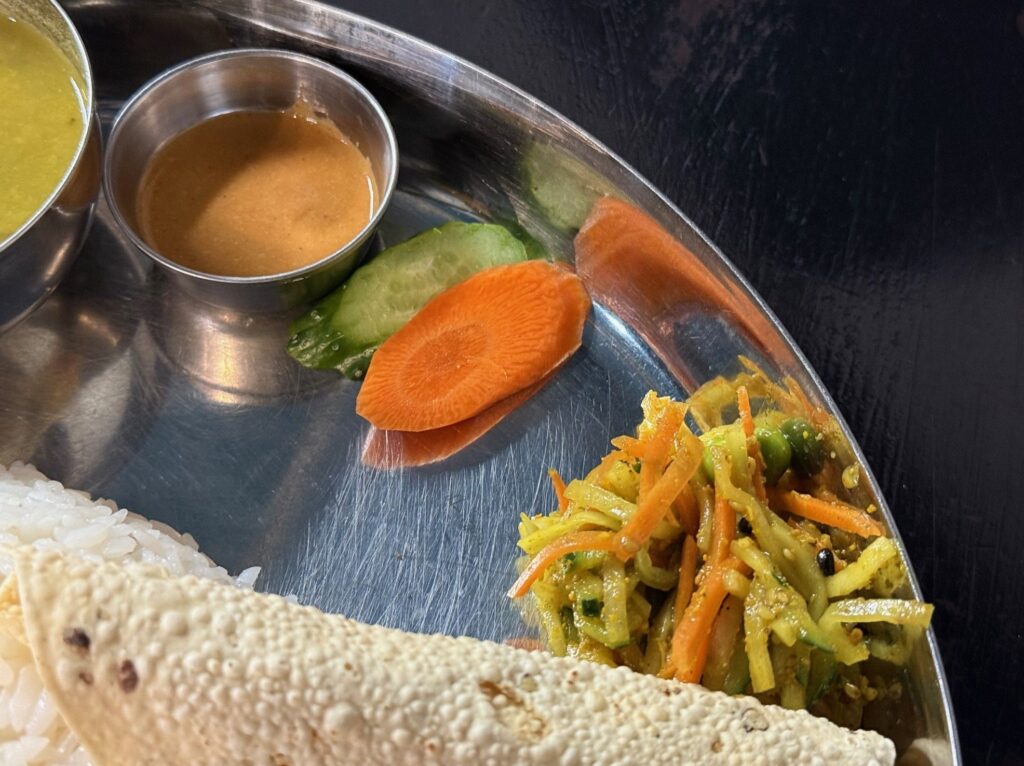 トマトのアチャール、スライス野菜、大根、人参、胡瓜のミックスアチャール、パパドゥ、