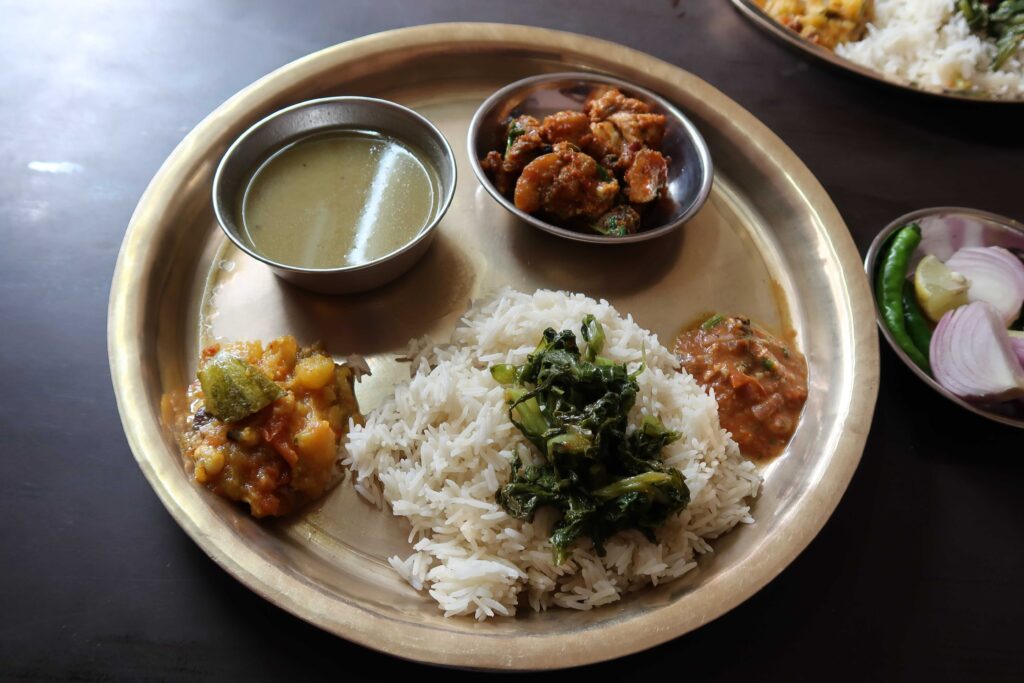 どの国にも、その国の独特の、他の国とは異なる料理があります。ネパールの場合、いくつかの宗教による多様性はありますが、ある一皿がこの国の料理を特徴づけるようになりました。それがダルバートタルカリ dal-bhat-tarkari です。ダル dal はレンズ豆のソースで、バート(ご飯)bhat と一緒に食べます。タルカリ tarkari は野菜カリーの一般的な呼び名であり、季節によって採れる野菜によって、またその地方の好みによって、さまざまな方法で調理されます。しばしばアチャール(漬物)achar が添えられ、味に深みを増します。肉カリーもまた、特別な機会やお祭りの際にはよく供されます。