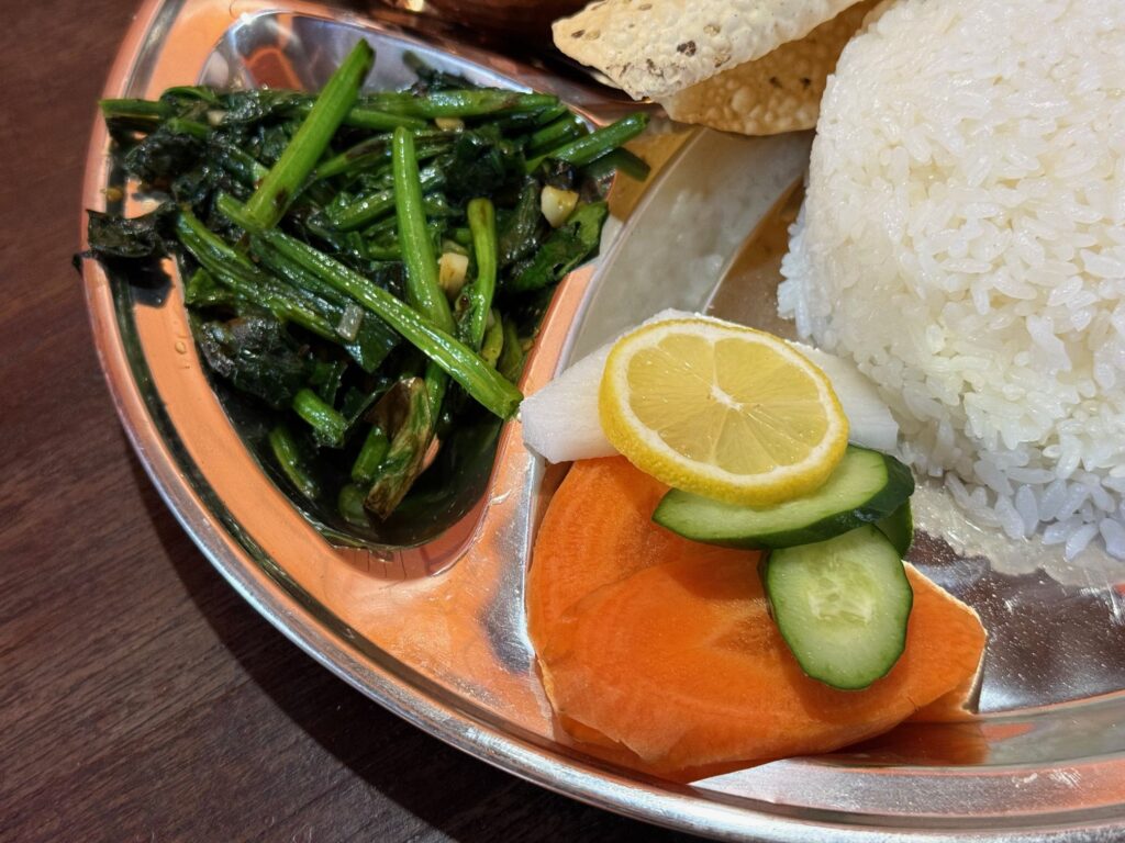 スライス野菜、青菜炒め、パパドゥが並びました。
