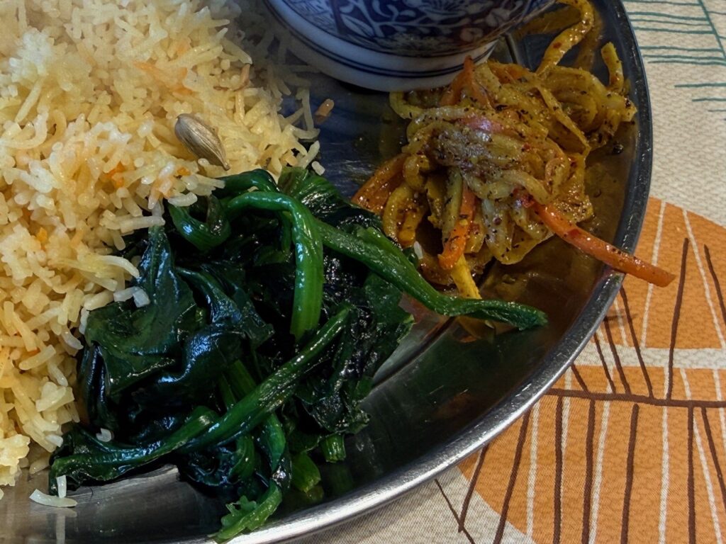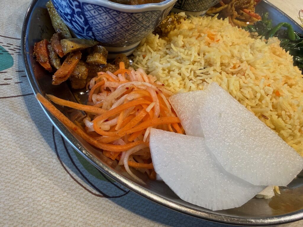 青菜炒め、発酵した細切りの大根と人参のアチャールが並びました。