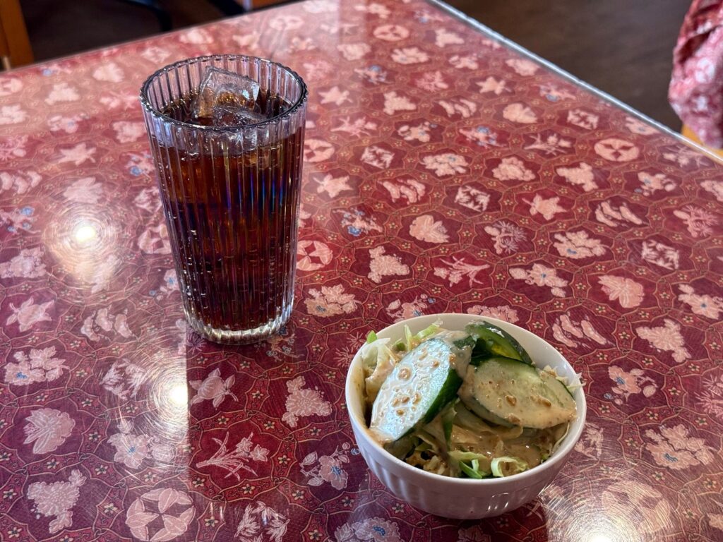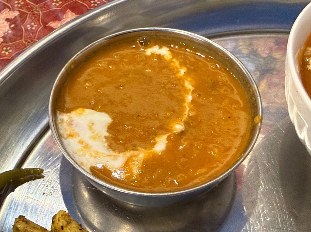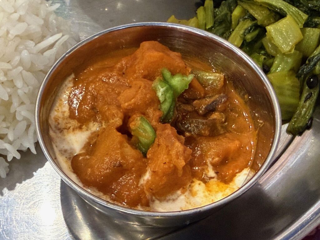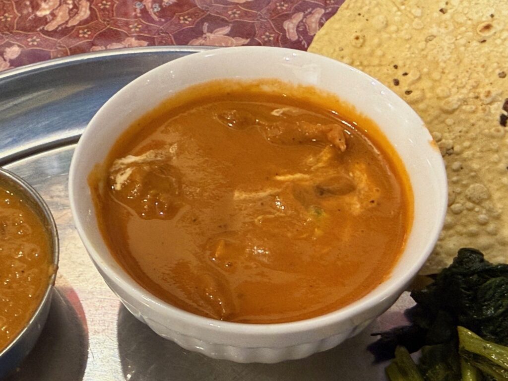 インネパ店のダルバート探し、大阪市西淀川区の「SAGUN」さんへ伺いました。メニューに『ネパーリカナセット Nepali Khana Set』と『タカリセット Thakali Set』を用意されており、違いはメインのカリーが 1種か 2種だけだそうで、前者をマトンでお願いしました。チャナのみのダルカレー、マトンではなく出てきたチキンカレー、じゃが芋とインゲンの野菜カレー、いずれもナン&カレー仕様です。青菜炒め、パパドゥ、大根のアチャールが並びました。コーラとサラダも供されました。
