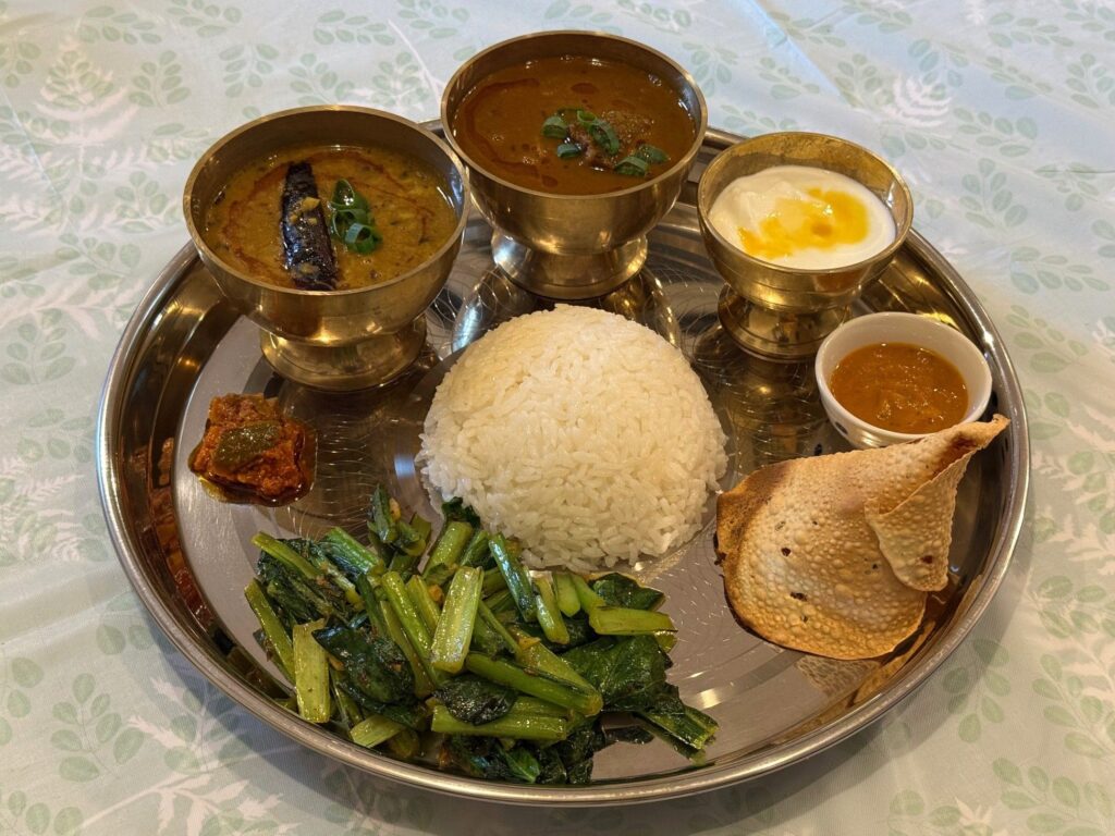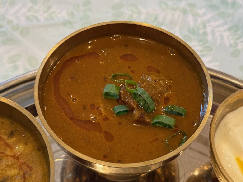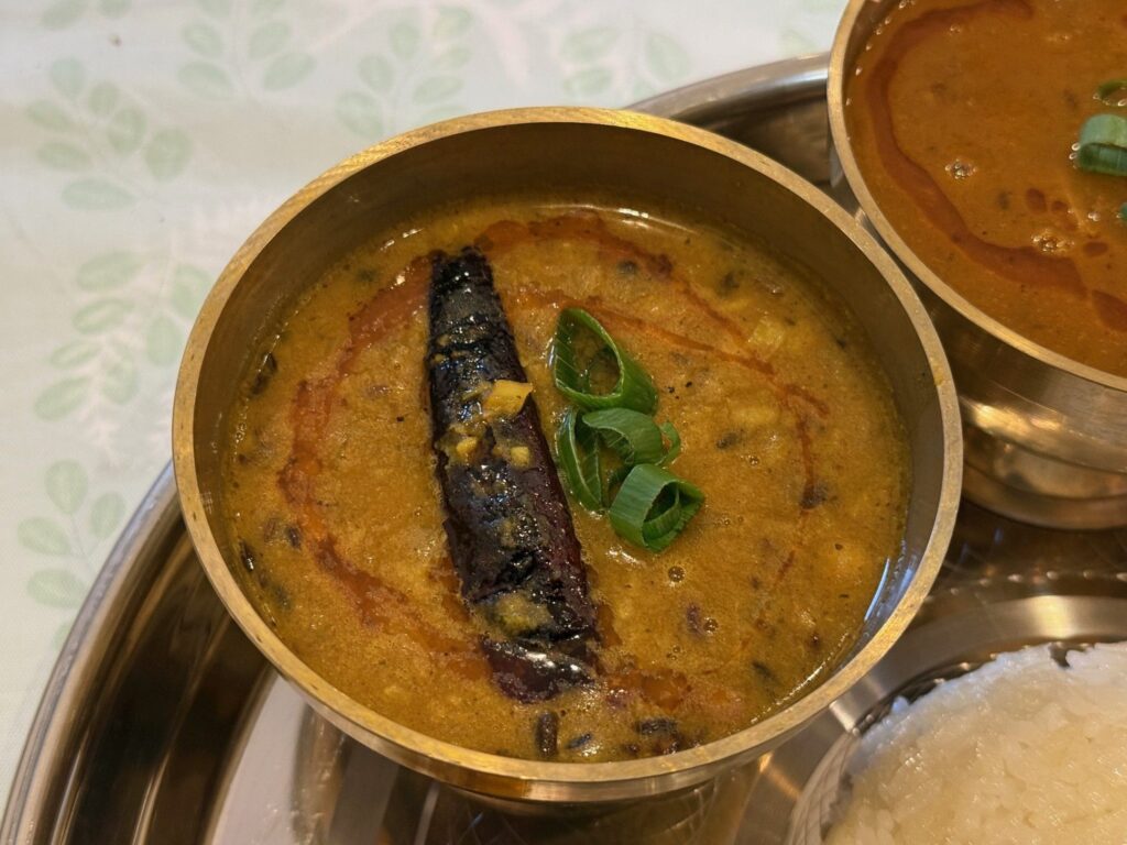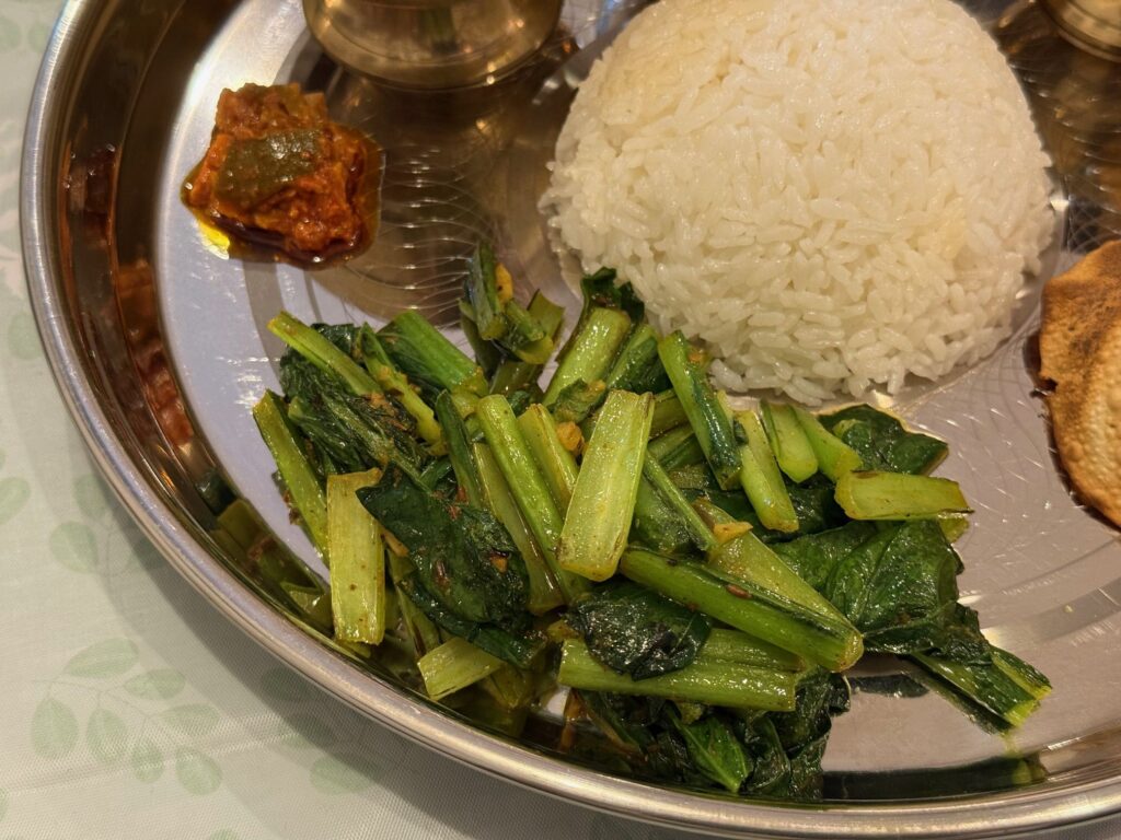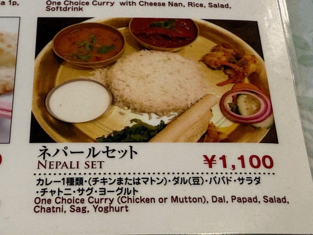 インネパ店のダルバート探し、東大阪市の「COCONUT CURRY ココナッツカレー」さんへ伺いました。ランチメニューにダルバート『ネパールセット Nepali Set』を用意されており、マトンでお願いしました。ダルは、マス、ムスロ、ムング、チャナのミックス、骨付き皮付き肉が使われたネパール仕様のマトンカリー、ダヒ、トマトのアチャール、パパドゥ、青菜炒め、青マンゴーのアチャールが並びました。サラダとチヤも頂きました。