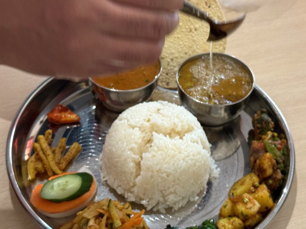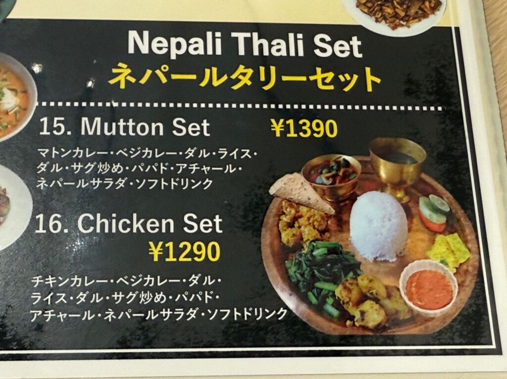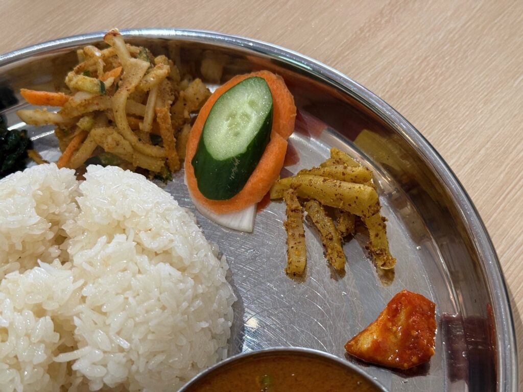 大阪市浪速区の「CHANDRAMA チャンドラマ」さんへ再訪です。『Nepali Thali Set ネパールタリーセット』を、チキンセットでお願いしました。ダルはマス、ムスロ、ムング、チャナのミックス、骨付き肉のチキンカリー、カリフラワー、ブロッコリー、人参、インゲンのタルカリ、じゃが芋のアチャール、青菜炒め、人参、胡瓜、玉葱のアチャール、スライス野菜、大根のアチャール、青マンゴーのアチャール、パパドゥが並びます。テーブルでのギーのサービスもあります。スープとチヤも頂きました。
