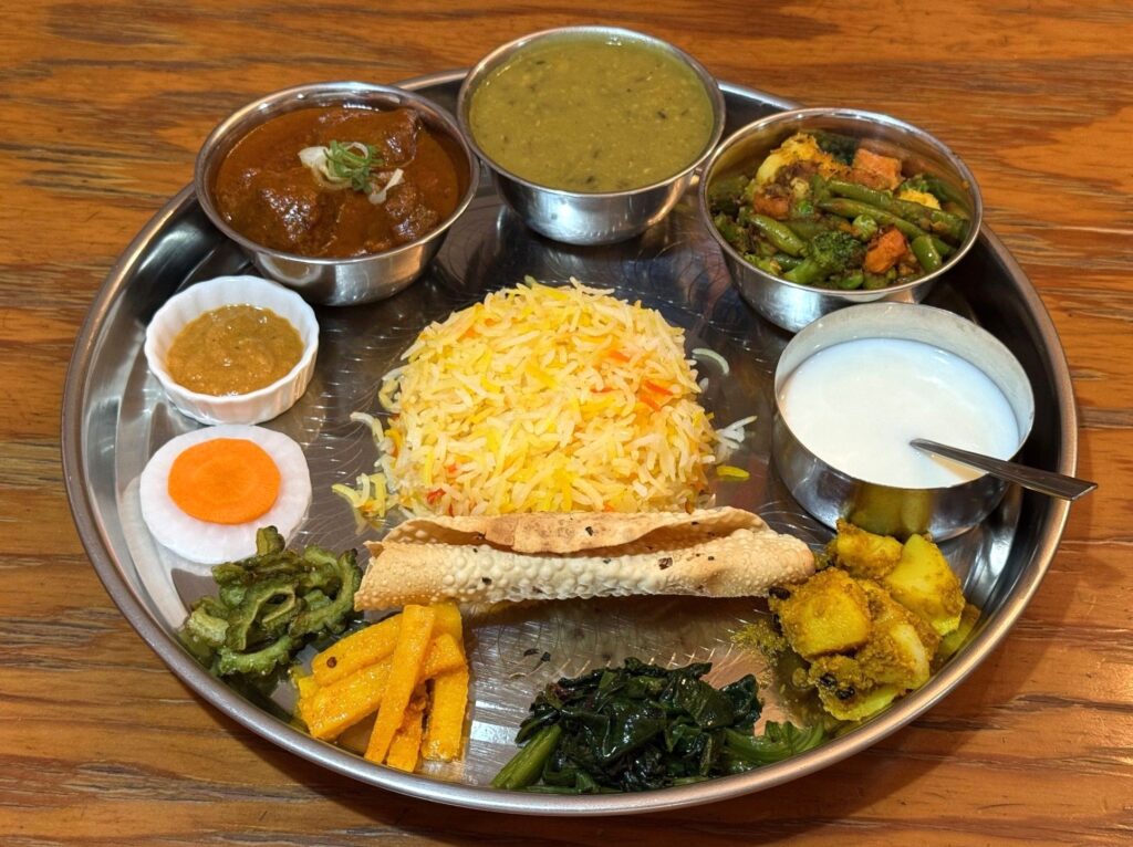 豊中市の「HAASA KITCHEN ハーサキッチン」さんの『ネパールタリセット Nepali Thali Set』です。ダルはマス、ムスロ、ムング、チャナのミックス、