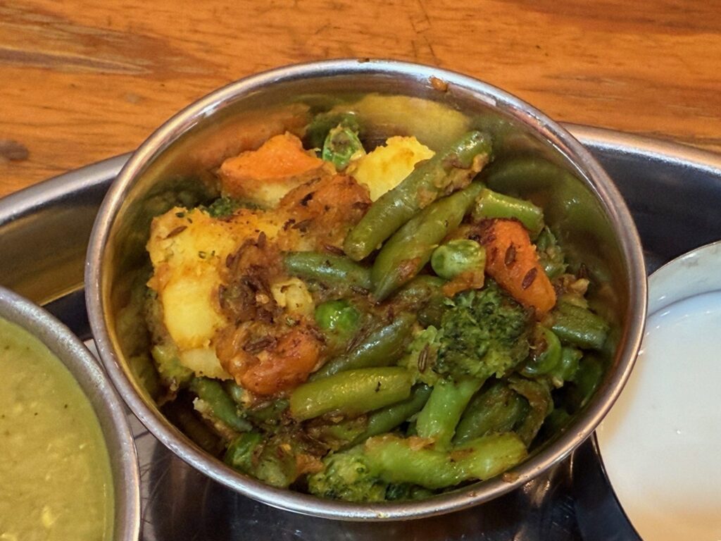 じゃが芋、ブロッコリー、人参、インゲン、牛蒡、グリーンピースのタルカリ、