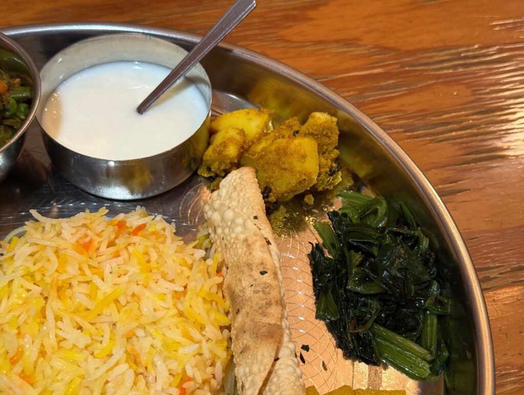 ダヒ、じゃが芋のアチャール、青菜炒め、パパドゥ、