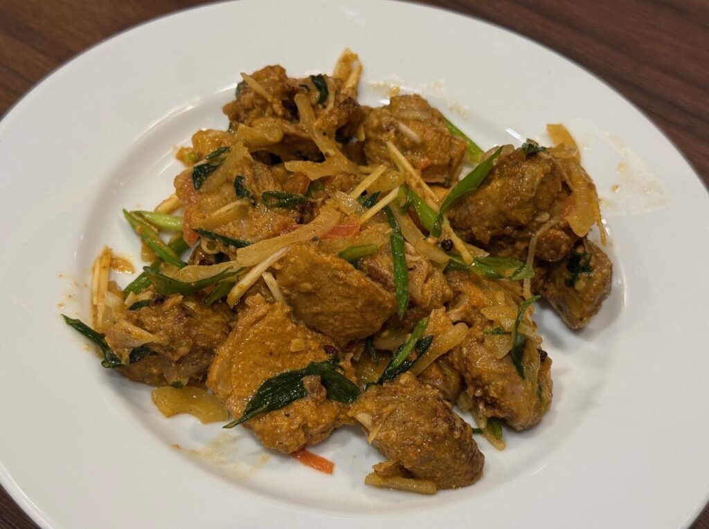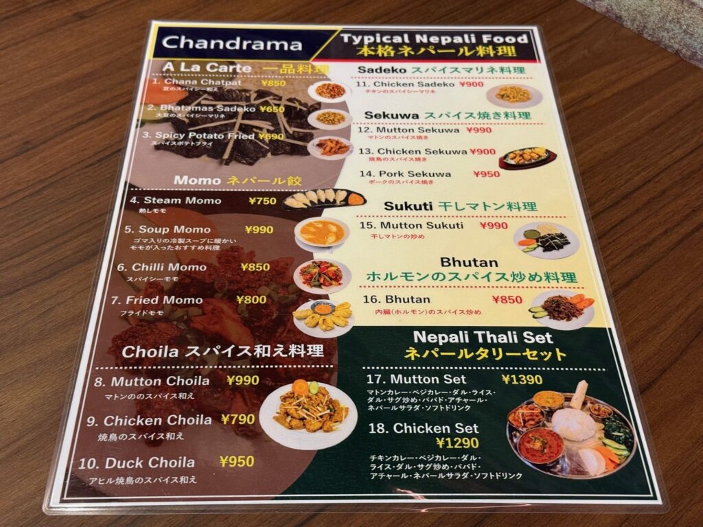 インネパ店のダルバート探し、西宮市の「CHANDRAMA」さんへ伺いました。大阪市浪速区の「CHANDRAMA」さんの 2号店かと期待しましたが、関係は無いとの事でした。よく似た体裁のメニューに『ネパールタリセット Nepali Thali Set』を用意されており、マトンでお願いしました。豆カレーは、マス、ムスロ、ムング、チャナのミックス、マトンカレーとともにナン&カレー仕様、じゃが芋、人参、ブロッコリー、インゲン、グリーンピースのタルカリ、青菜炒め、大蒜のアチャール、スライス野菜、パパドゥが並びました。ダックチョイラも頼んでみましたが、こちらはネパール仕様でした。チヤも頂きました。