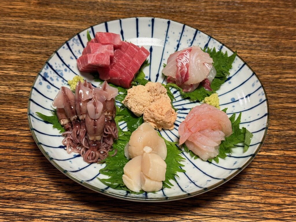 とろ、鯛、甘海老、帆立、蛍烏賊、鯛の子煮の『お造り盛り合わせ』(2人前)、