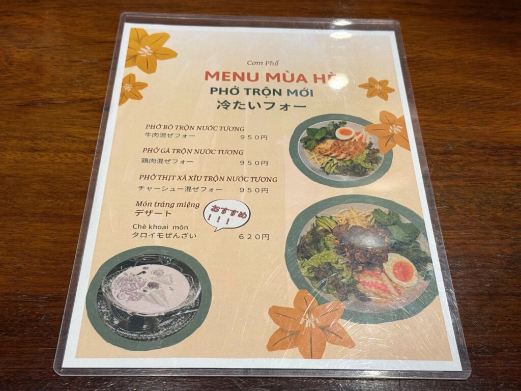 川西市のベトナム料理店「Cơm Phố コムフォー」さんへ伺うと、新メニューが用意されており『冷たいフォー』と記されていました。その中から、チャーシュー混ぜフォー Phở Thịt Xá Xíu Trộn Nước Tương をお願いし、蒸し春巻き Bánh Cuốn と、黒豆のチェー Chè Đỗ Đen も頂きました。