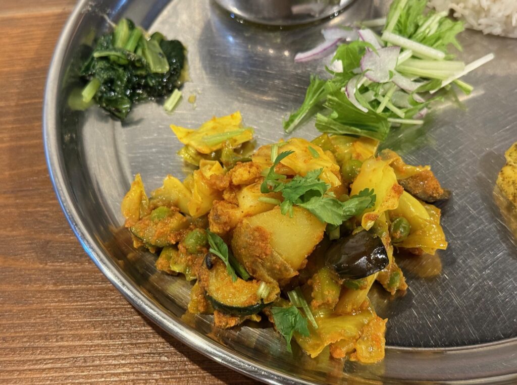 茄子、じゃが芋、人参、ズッキーニ、キャベツ、グリーンピースのタルカリ、生野菜、青菜炒めも並びました。