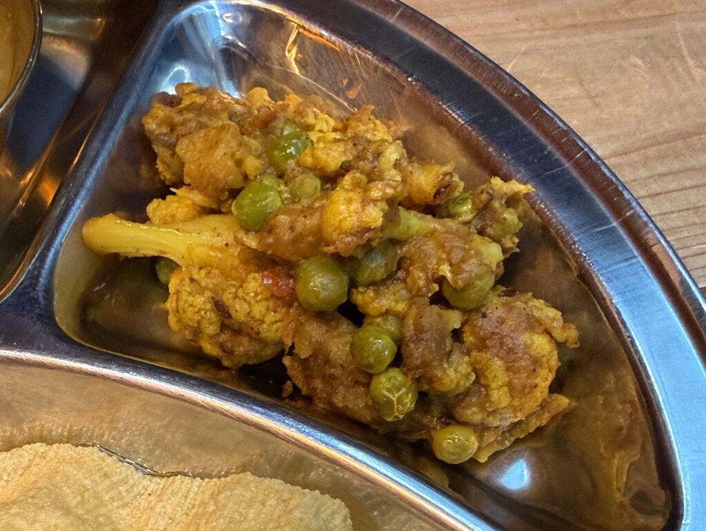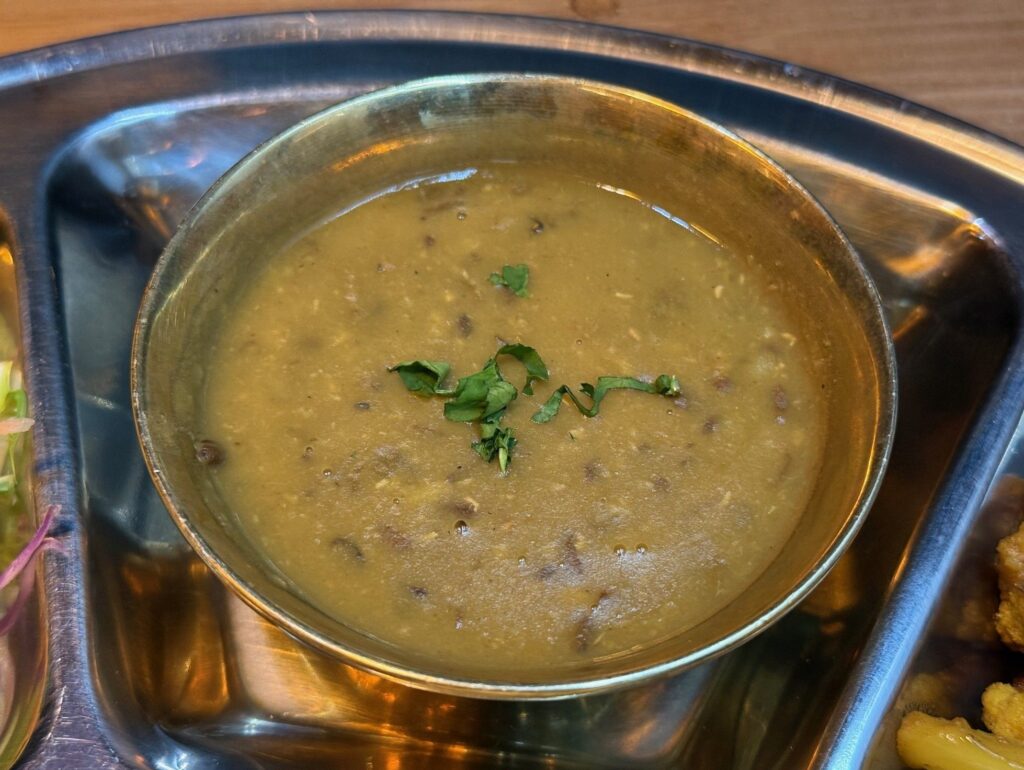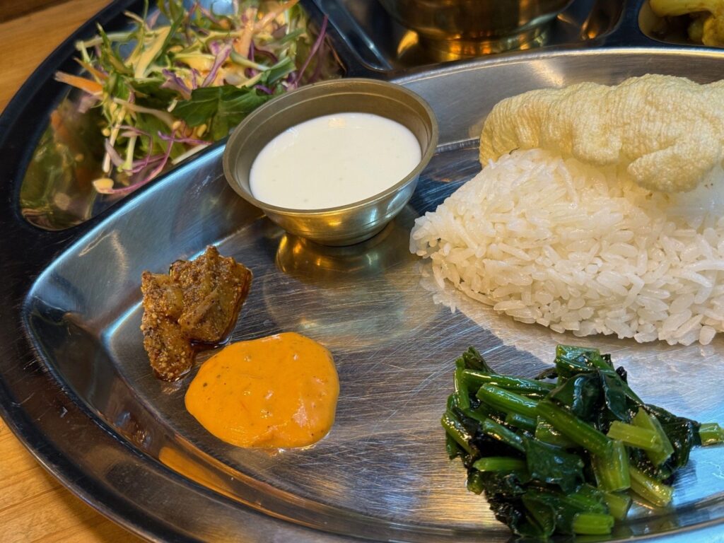 大阪市住之江区の「JUJU DHAU & NEWA KITCHEN」さんへ再訪です。パニプリ、チキンチョイラ、ベジカナセット Veg Khana Setをお願いしました。ダルは、マス、ムスロ、ムング、ラハル、チャナのミックス、カリフラワーとグリーンピースのタルカリ、青菜炒め、トマトのアチャール、大根のアチャール、ダヒ、サラダ、パパドゥが並びました。追加でズーズーダウとチヤも頂きました。